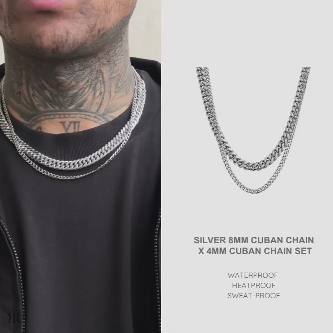 SILVER 8MM CUBAN CHAIN X 4MM CUBAN CHAIN SET